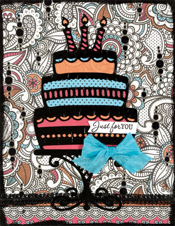 Die cut a long label from Rhapsody orange paper. Stamp “Happy Birthday in the center. Mat on black dot paper with a 1/16” border. Foam tape to card as shown. Use foam tape to assemble the flower image from the Papier Tole and glue it to the bottom left corner. Add Turquoise Stickles as shown.