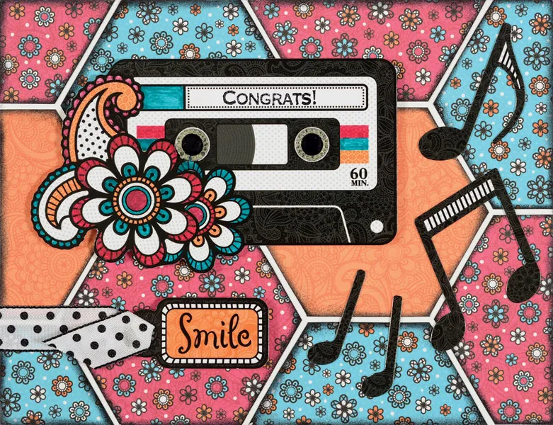 Punch out the cassette tape, 4 music notes, and “Smile” tag from the Rhapsody die-cuts sheet. Remove the nibs. Glue the cassette tape ¾” from the top and ½” from the left. Glue the music notes scattered to the right and below the cassette tape as shown. Thread a white polka dot ribbon through the tag, leaving 1” at the end and trim the end . Foam tape the tag to the card 1 1/2” from the left and ¾” from the bottom. Glue the ribbon to the left of the tag. Zot™ the angled end as shown.