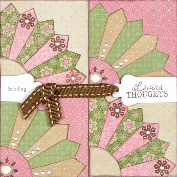 For the Front: Place the card with the fold at the top. Trim the card to a 5” square. Create 4 paper Sun Rays from the Paper Patchwork 2 Template. Note: do not use the “Sun Ray Center&rdquo,; instead trace the center from the Top B Layer (omitting the rays). After cutting out each piece, ink the edges lightly with Timber Brown StazOn®. For 2 of the squares, use Kindred Spirits ivory dot paper for the Bottom and Center, Kindred Spirits green floral paper for Top A, and Kindred Spirits pink paper for Top B. For the other two squares, use Kindred Spirits pink diamond paper for the Bottom and Center, Kindred Spirits green paper for Top A, and Kindred Spirits tan dot paper for Top B. Glue the ivory squares as shown.