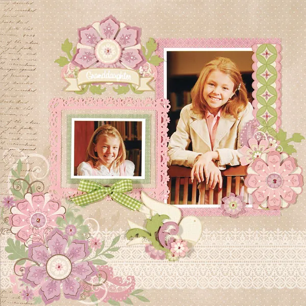 Place the Kindred Spirit border paper with the corner embellishment on the bottom left. Mat 4”x6” photo with white cardstock, leaving 1/8” border. Mat with Kindred Spirit pink diamond paper, leaving 1/2” border. Glue 1” from the right and 1 1/2” from the top of the page.