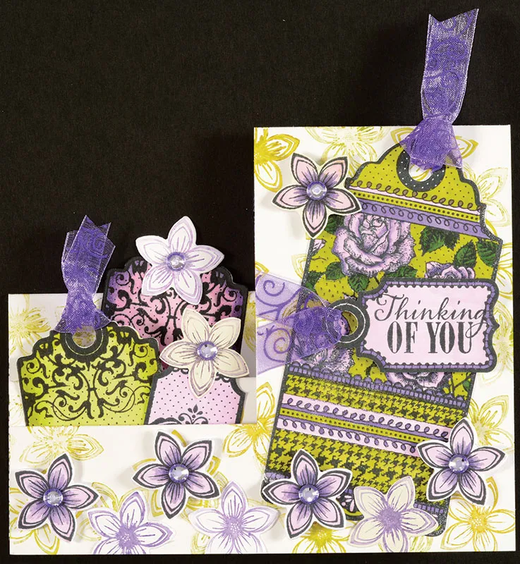 Stamp a roses tag onto white cardstock with Tuxedo Black Memento ink. Cut out the tag with the matching die. Color in the tag with CG2, DG3, LV1, and LV2. Fold 6" of sheer purple swirl ribbon and pull the folded end through the front of the hole, then thread the ends through that loop. Trim ends at an angle. Glue to the tall panel of the card, angled slightly as shown. Stamp a small tag on white cardstock and stamp "Thinking of You" inside the tag (with the hole on the left). Color the tag with LV1 and LV2. Cut out with the matching die. Pull 4" of sheer purple swirl ribbon through the hole. Foam tape the tag 1/4" from the right and 1 3/4" from the top. Use Medium Zots to attach the ends of the ribbon to the card, then trim excess.