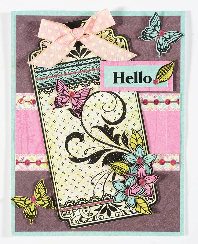 Use the largest cutting die to cut a tag from Unforgettable border paper. Stamp the tag on the die-cut. Stamp the top of the large tag on Unforgettable teal paper. Cut just the top border of the tag out, and glue to the die-cut tag. Place a border Dazzles™ on the top and bottom of the tag. Use the Flower cutting die to cut two teal flowers, & one pink flower. Use the Leaf cutting die to cut four green leaves. Use the Butterfly cutting die to cut one butterfly from teal, green, and pink. Use the coordinating stamps to stamp each of the shapes. Shape the flowers by curling the petals over a pencil.