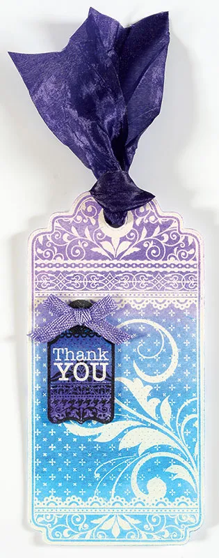 For the front: Place your card with the fold on the left. Place the largest tag die face down on the front of your card, with the left die edge lined up just outside of the fold. Secure with tiny pieces of tape if desired (I found it helpful). Run through your die-cutting machine. When you remove the piece, you should have a tag-shaped card. Swipe over the card front with the Perfect Printing Pouch. Stamp the large tag on it with Versamark ink. Emboss with white super fine embossing powder. Using the Gelatos, loosely scribble over the top third of the tag with Grape, followed by Boysenberry, Blueberry, and Cotton Candy going down the length of the tag. Take a damp paper towel and brush it over the top of the tag and work your way down. You don't want to rub so hard that the cardstock starts to disintegrate, only enough to blend the colors nicely and wipe the color off of the embossed design. If necessary, place between paper towels under a heavy book to keep flat while drying. Fold 8" of wide dark purple crepe ribbon in half. Thread the folded part through the front flap of the card (through the hole at the top of the tag). Insert the ends through that folded loop and pull tight. Adjust as necessary, and trim ends in a V.