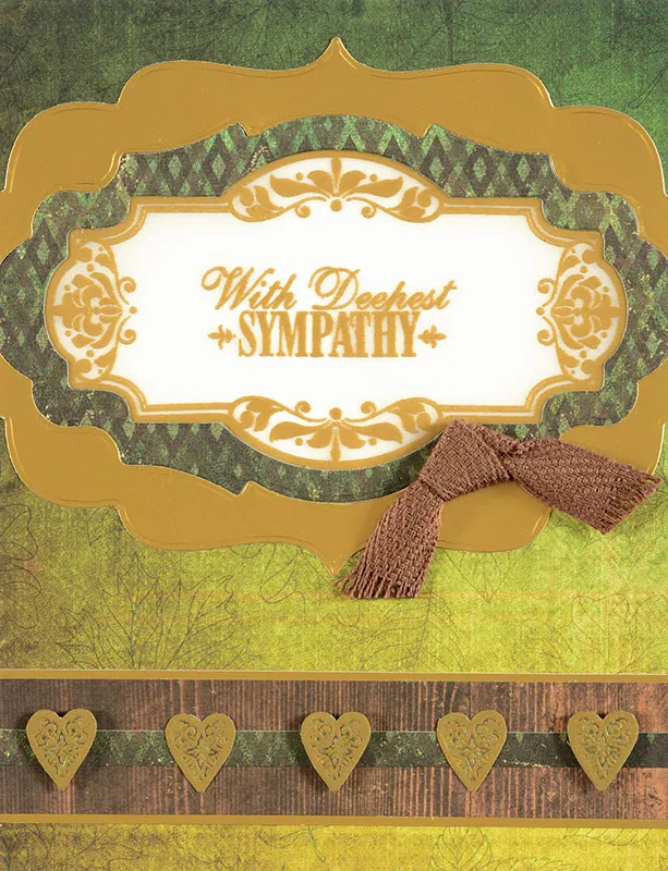 Cut 4 3/4" x 3 1/2" of plain white vellum. Swipe over the top of it with the Perfect Printing Pouch. Stamp the 4 1/4" label in the center with VersaMark™ ink, and stamp "With Deepest Sympathy" in the center. Pour on the gold embossing powder and emboss with a heat gun. Turn the vellum piece over and apply glue (or a few small Zots™) around the very edges of it. Turn it back over to the front and glue it to the front of your window on the white card, centering the stamped label within the die-cut label opening. Glue the background piece over the front of the card, lining up the window opening. This sandwiches your vellum window between the cardstock of the card base and your decorated layers, so it doesn't show on the inside of the card.
