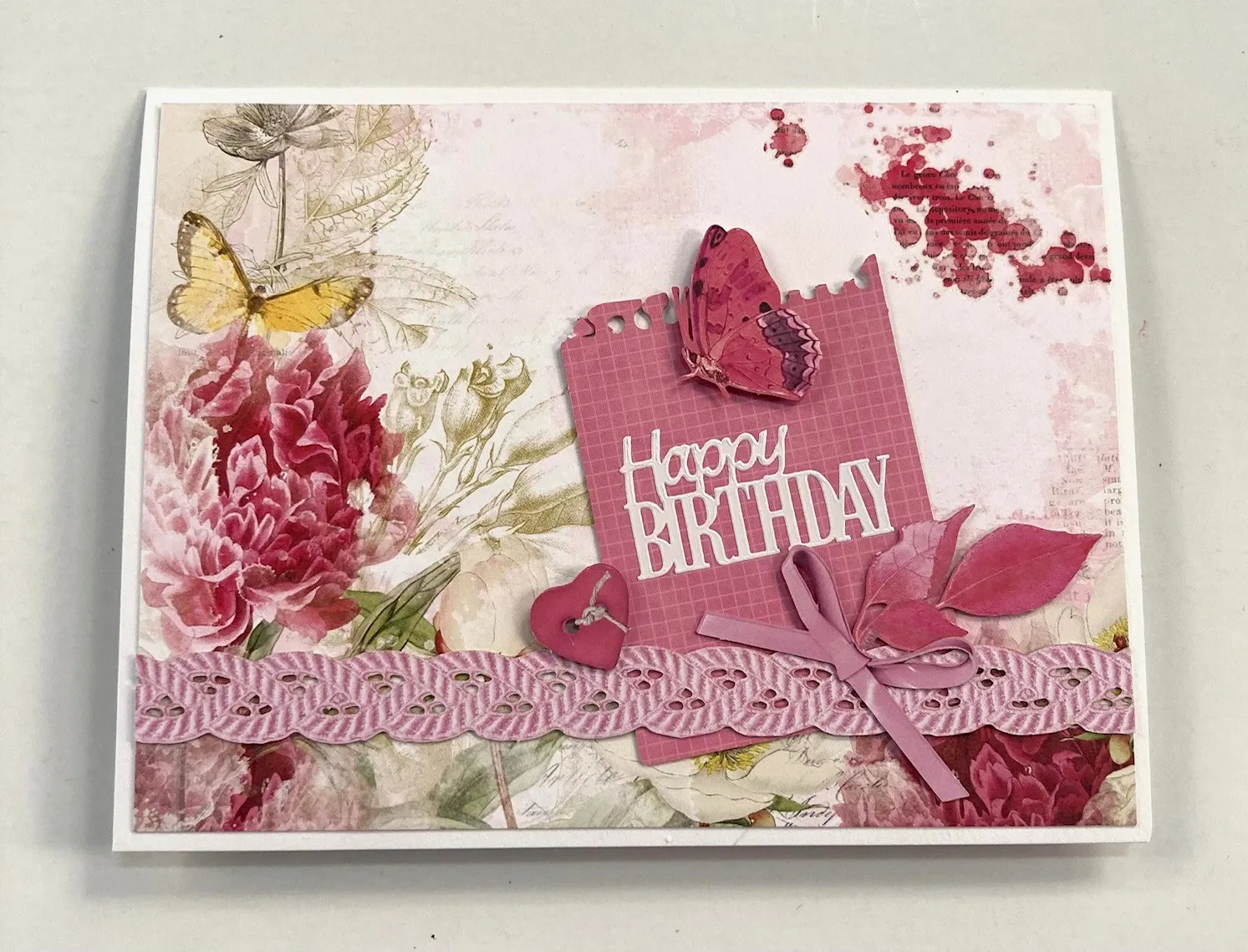 2. Place white “happy birthday” Dazzles™ on the dark pink mesh note die-cut. Trim a braid border die-cut to 6¼", then glue the note and the braid on the floral cardstock as shown. Foam tape a butterfly to the note at the top and a heart button overlapping the note and braid at the lower left. Glue bow and leaf die-cuts as shown.