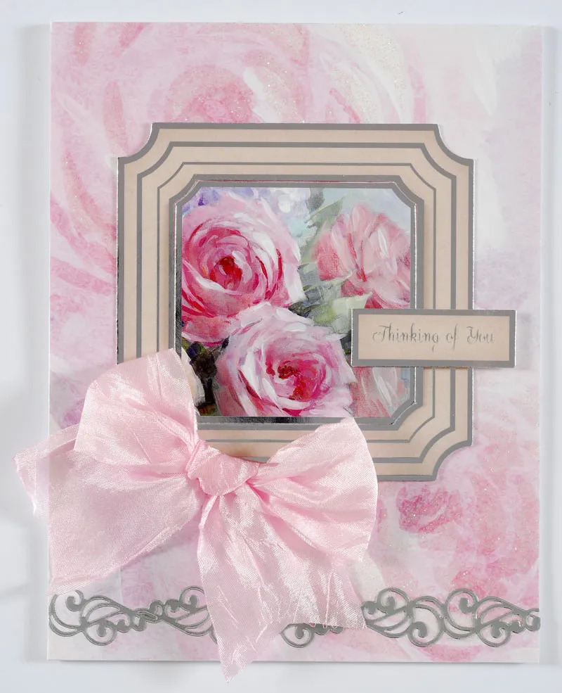 Card Front: Place your card with the fold on the left. Cover the card front with Shimmering Watercolors pink roses glittered cardstock. Punch out the roses/tan “Flowers in the Window” foiled card topper pieces and the matching tan foiled word blocks. Glue the frame centered on the card front, 1” from the top. Foam tape the roses piece inside the frame. Foam tape the right edge of the “Thinking of You” word block overlapping the right edge of the card topper.