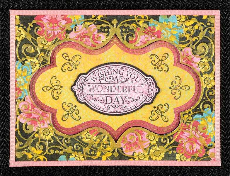 For the Front: Place the card with the fold on the top. Cut a 6"x4 1/4" piece of Mirage black floral paper and emboss using the Swirl Frame Embossing Folder and your die cutting/embossing machine. Ink your Gold StazOn® ink pad and dab it lightly with a cosmetic sponge. Swipe very lightly all over the top of the embossed design with the sponge so that the gold hits the raised areas. Dab a tiny bit of glue stick onto the corners of the piece and tack down to the center of the card (so as to keep it in place but still be removable). Open the card and place it on your cutting mat. Carefully cut out the curved frame shape on the outermost line, going through both layers. Remove the embossed paper. Using Zots™ in the corners, attach 5 1/2"x3 1/2" clear acetate over the opening on the front of the card. Glue the embossed piece to the card, lining up the openings. Glue 1/4" wide black metallic ribbon on the 4 outside edges of the card using Tacky Glue. Glue 1/8" wide pink grosgrain ribbon around the card, just inside the black metallic ribbon.