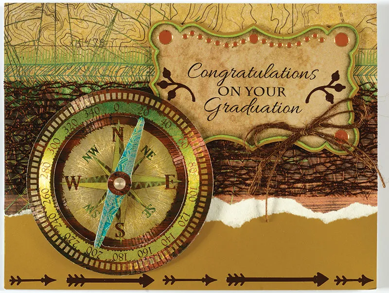 For the front: Place your card with the fold on the top. Glue 6 1/2" x 2" of metallic gold paper across the bottom. Cut 6 1/2" x 5" of border paper and place the border along the top. Tear off the bottom 1 1/2" of the paper, leaving a white torn edge. Glue to the card aligned at the top. Glue brown web ribbon across the center (I used my finger and Tacky Glue to dab some glue on the back of the ribbon). Cut 4 1/2" x 3" of light brown and print the greeting in the center. To do this, I use a technique called computer journaling: Type up your chosen greeting and print it on the page with plenty of room around it (in Word, it helps to insert a text box so the words are easily moved wherever you want on the page). Place the printed page over a light source and align the light brown paper over the printed part to make sure it's centered. Use small pieces of Scotch tape to secure in place. Run through your printer, printing the exact same way, and the words will land on the light brown paper. Trace a Bracket Sign around the greeting and cut out. Ink edges using Timber Brown StazOn® and a cosmetic sponge. Mat on green and mat again on metallic gold paper. Foam tape to the card 3/8" from the top and 1/4" from the right. Place copper Dazzles™ along the top and in the corners of the label as shown. Place small branch Dazzles™ on either side of the greeting. Tie a bow with 2 pieces of brown twine together and Glue to the bottom right of the greeting with Zots™. Assemble the compass rose paper tole piece and foam tape 1/2" from the bottom and left edges. Place arrows going across the bottom of the card pointing to the right. If you need to make an arrow shorter to fit, you can do so by cutting off the arrowhead and placing it farther down the arrow, then trimming any excess.