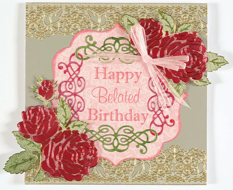 For the front: Place your card with the fold on the top. Cut the card to a 5" square. Cover the card with metallic silver paper. Place silver border Dazzles™ across the top and bottom edges as shown, trimming excess. Cut the square frame from pink lace paper and take out the center shape. Ink the edges with a cosmetic sponge and Pink Sky ink. Cut out 4 flourishes. Color 2 green and 2 red. Glue the red ones on the right and left of the pink piece and glue the green ones on the top and bottom as shown. Stamp "Happy Belated Birthday" in the center of the flourishes. Place a large 2-rose Dazzles™ onto silver paper. Color the roses with CR11 and color the leaves with DG3 (using Spectrum Noir™ pens). Cut out. Do the same with a large 3-rose Dazzles™. Foam tape these Dazzles™ at the top right and bottom left as shown, going off the card a bit. Tie a bow with three 8" pieces of narrow pink grosgrain and glue to the upper right of the greeting as shown.