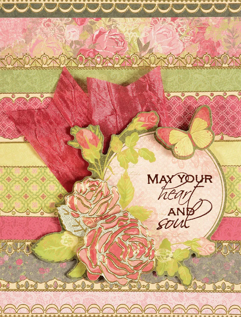 Swipe over the circle paper tole label piece with the Perfect Printing Pouch. Stamp and emboss "May your heart & soul" in brown in the center. Foam tape the butterfly layer to the paper tole with extra foam tape under the wings for added dimension. Find the large roses Dazzles™ on the Scrapbooking Dazzles™ sheets that look most like the roses on the paper tole. Peel these off the sheet and place the large rose lined up on the top layer of the matching paper tole piece. Cut along the edge of the paper tole. Place the medium rose Dazzles™ on the corresponding rose on the lower layer of the paper tole and trim along the edge of the paper tole, leaving one leaf. Finish assembling the paper tole with foam tape. Foam tape to the card near the lower right, as shown.