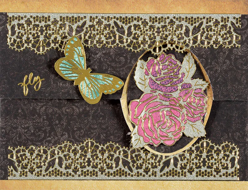 TECHNIQUE: Back the Dazzles&trade,; Place the roses part of the three cluster Dazzles™ on pink paper. Cut close to the Dazzles™ edge. Place the two cluster Dazzles™ with rose bud on pink paper, do the same. Use the same process to place the butterfly on teal circles paper.