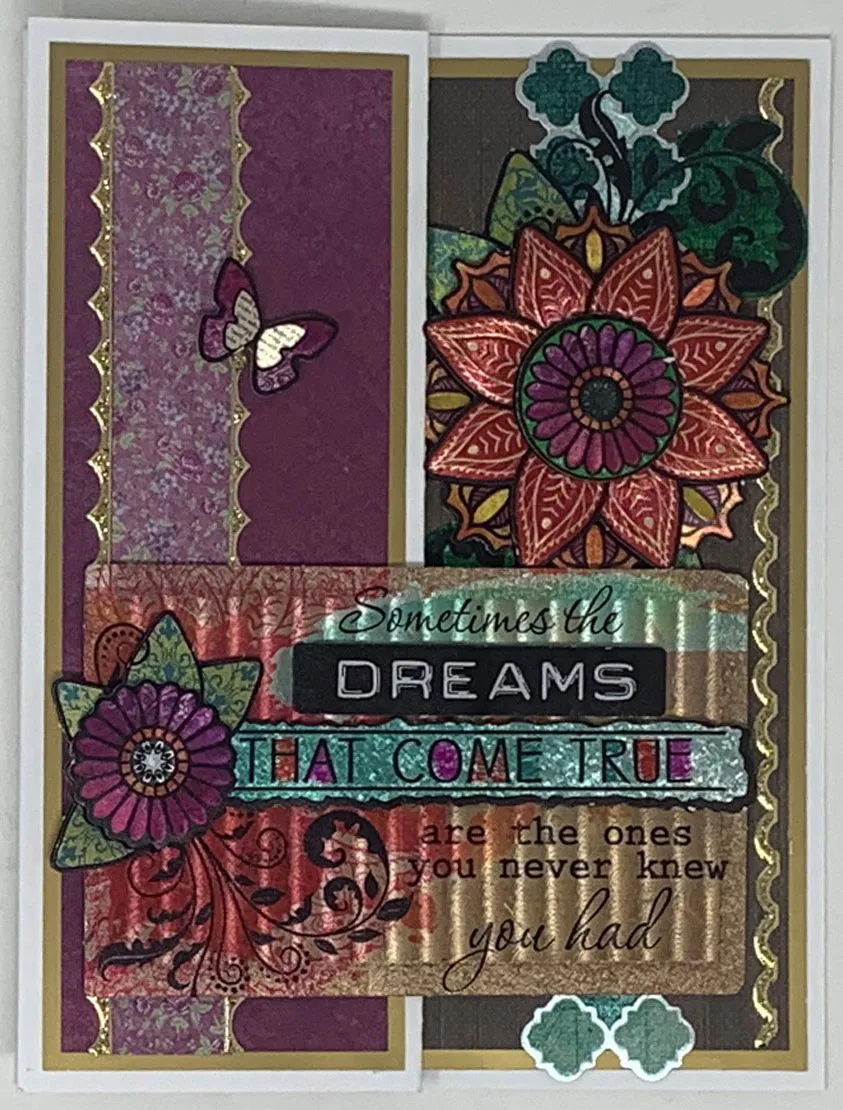 3. Assemble the Bohemian Dreams “sometimes the dreams…” paper tole die-cuts with foam tape between the layers. Foam tape the the left half of the design to the front, ⅝" from the bottom. Foam tape an extra art foil butterfly to the front as shown.