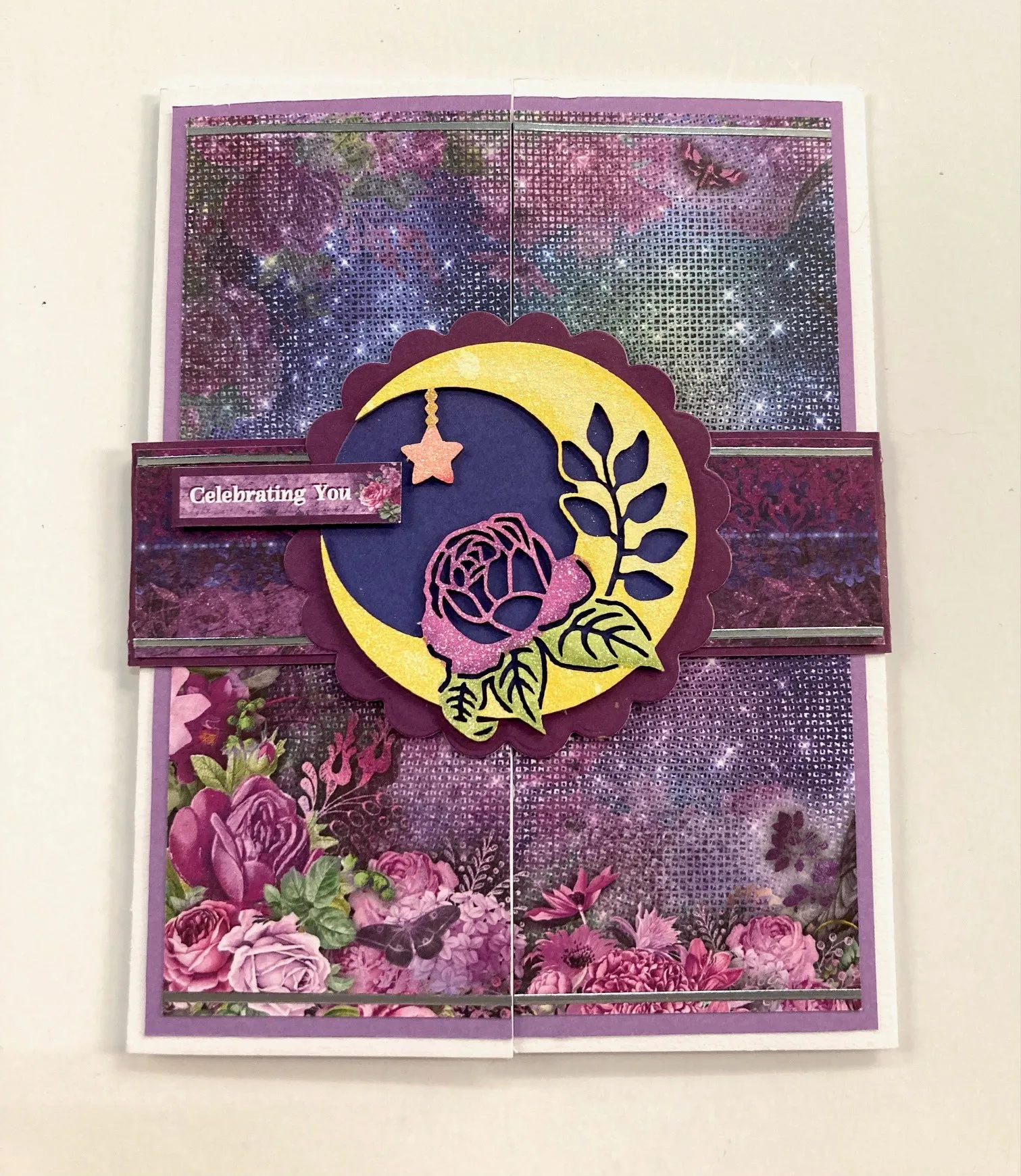 10. Color the rose and star chipboard shape with markers, then spritz it with white ink. Color the moon and star with the sparkle ink. Die cut a 2½" dark blue cardstock circle and glue the moon to it. Die cut a 3" purple scalloped circle and glue the moon’s circle to it. Glue the circles to the center front of the belly band. Cut out the “celebrating you” cutout and foam tape it to the band as shown.