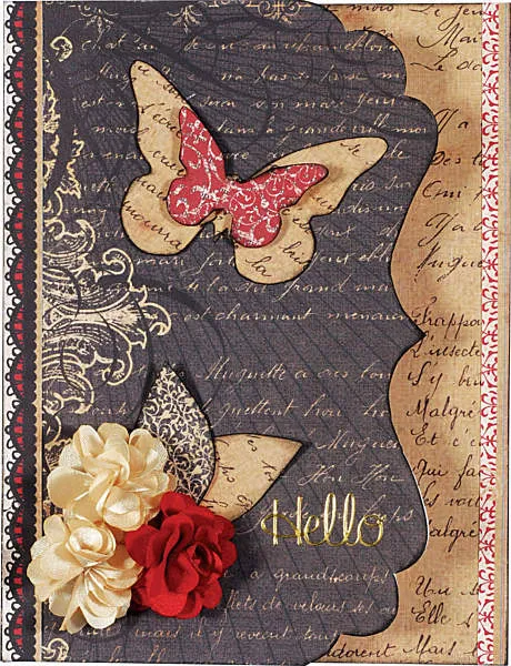 Trace a larger butterfly on tan words paper and two small butterflies on red flourish paper. Ink the edges black. Glue larger butterfly angled on the card as shown. Foam tape one smaller butterfly in the center.