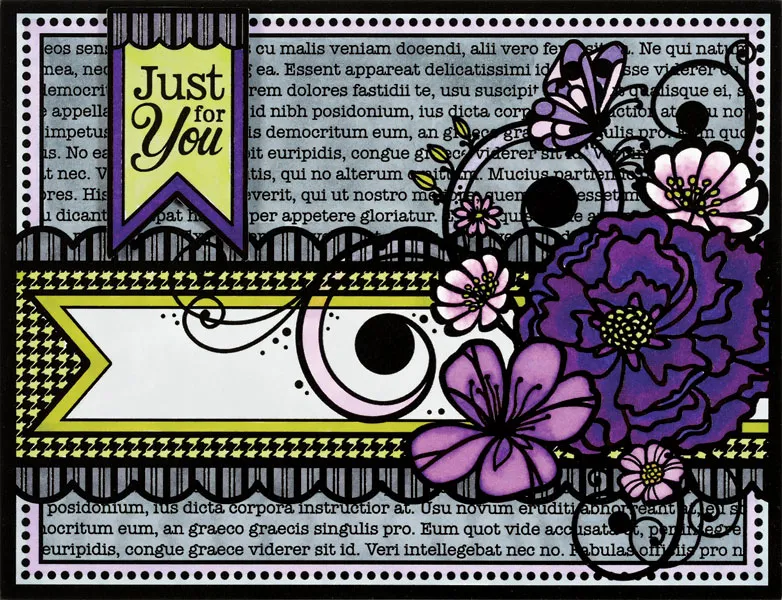 For the Front: Place the card with the fold on the top. Cover the card with the floral card topper. To color the card topper: Use the following Spectrum Noir pens, blending where necessary by first coloring with the darker, then the lighter color to blend. Large focal flower: Purples- LV3, PL5. Medium focal flower: PL4, PL2. Small flowers: PL2 and Blender pen (from the Essentials). Butterfly: LV2, LV1. Background: Cool Grays- IG4. Some of the swirls & inner banner shape: LV1. Striped scallop border: IG6. Outer border: LV1, IG2. Houndstooth patterned area, border around banner, flower centers/leaves: Greens- CG2, CG1.