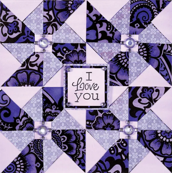 Cut a 1 1/8" square of smooth white cardstock and color with LV1. Stamp "I Love You" in the center with black Stazon. Mat on an already-colored piece of floral Color Me paper, leaving a 1/16" border. Mat again on floral pattern paper leaving a 1/16" border. Foam tape this greeting square in the center of the card. Add medium and small Lavender Bling to the centers of the pinwheels and corners of the greeting square as shown.