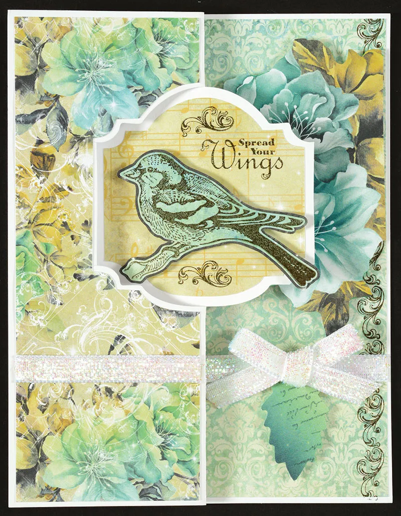 Assemble the card according to the package instructions. Use the templates on the package insert (I recommend making 3 copies and cutting the shapes out separately on the copies) to cover the card panels with the following papers: left side- floral, outside label- beige music, spine- black tapestry, inside label- black stripe, and right side- blue tapestry. On the outside (front) label, stamp a swirl on the top and bottom and stamp "Spread your wings" near the top right, as shown. Stamp a bird on blue floral corner paper and cut out, leaving a 1/16" border. Mat on black stars paper with a 1/16" border. Foam tape the bird to the center of the label as shown.