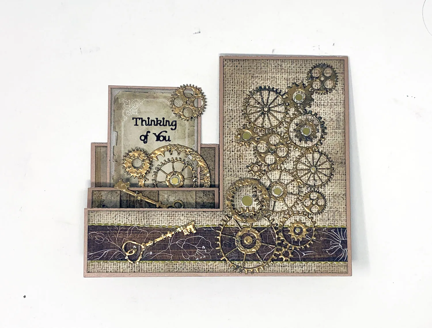 Glue the large gear cluster to the right front and foam tape a smaller gear as shown. Glue two keys and three more gears to the left front and steps, then place jewel Dazzles™ as shown.