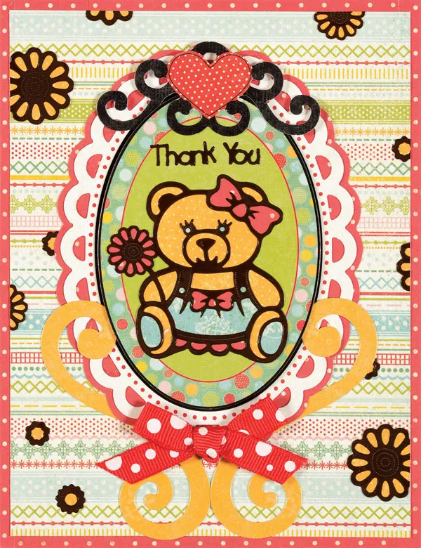 Back the flower bear with yellow, red, and blue papers using the following paper piecing technique. Place the flower bear sticky side up on the back of red dot paper. Carefully trace inside all the areas you want red. Cut out just outside the drawn shapes, then apply these pieces to their matching sections on the Dazzle. Repeat for the other colors as shown. Glue the finished bear to the bottom center of the green oval. Place "Thank You" at the top. Punch out the two yellow swirl die cuts and place them with the swirls wrapped around the lacy oval as shown. Glue to the oval, then glue the whole piece to the center of the card.