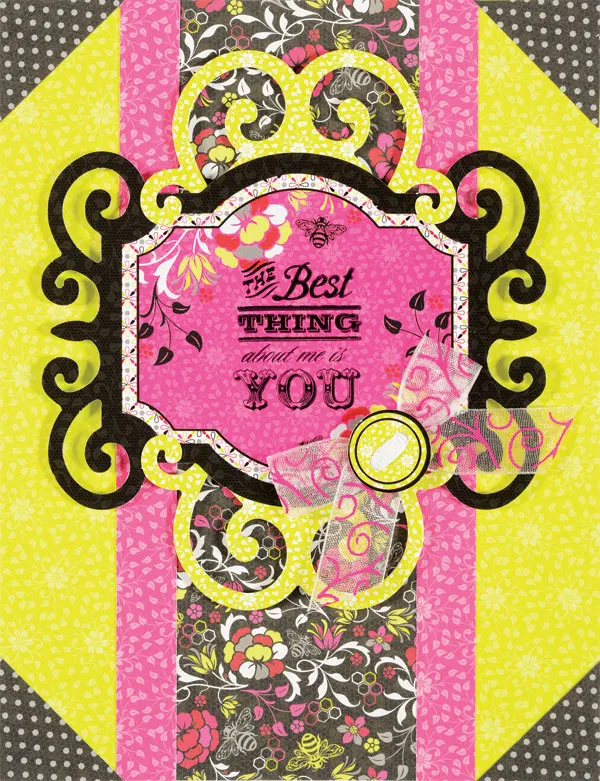 Punch out the swirly green oval die cut and the pink swirl frame die cut. Stamp "The Best Thing About Me Is You" in the center of the pink frame. Stack the pink frame on top of the green and lift the ends of the green swirls over the pink as shown. Glue the die cuts together and foam tape centered to the card, 1/2" from the top. Tie a bow with sheer pink swirl ribbon and Zot™ to the bottom right of the greeting. Insert narrow white grosgrain ribbon into the green button die cut, securing ends to the back of the button. Glue to the center of the bow with Zots™.