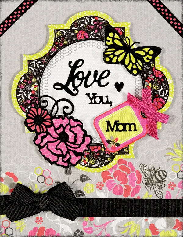 Punch out the large gray/floral frame and separate the gray inner circle. Glue the circle to the card centered, 1 1/4" from the top. Foam tape the outer frame centered around the circle. Punch out the small green/pink tag and glue to the frame at an angle as shown. Place "Love You" Dazzles on the gray circle, adding a small heart as shown. Place "Mom" on the small tag as shown. Tie a small bow of metallic pink ribbon and Zot to the top of the tag. Back the flower Dazzles with red and pink paper and glue to the bottom left of the frame as shown. Back a butterfly with green and glue to the top right of the frame as shown. Back 3" of the dot Dazzle ribbon border with red and cut in half. Glue each half across the each of the top two corners of the card as shown.