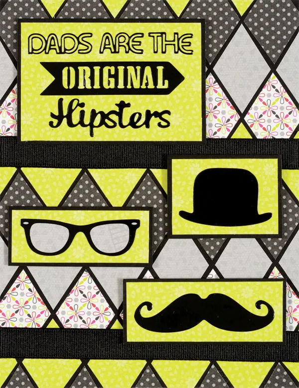 Cut 3" x 2" of green and mat on black cardstock with a 1/16" border. Center the "Dads Are The Original Hipsters" Dazzles on the piece and foam tape it to the card 1/2" from the top and 1/4" from the left. Cut 1 3/4" x 1 1/4 of green and mat on black the same way. Place the large hat Dazzle on it and foam tape to the card 1 3/4" from the top and 1/4" from the right. Cut 2 1/4" x 7/8" of green and mat on black. Place the glasses Dazzles™ on gray paper, then trim next to the Dazzles™ edge and glue centered. Foam tape the piece to the card 1/8" from the left and 2" from the bottom. Cut 2 3/4" x 1" of green and mat on black. Place the large mustache in the center and foam tape to the card 1/8" from the right and 3/4" from the bottom.