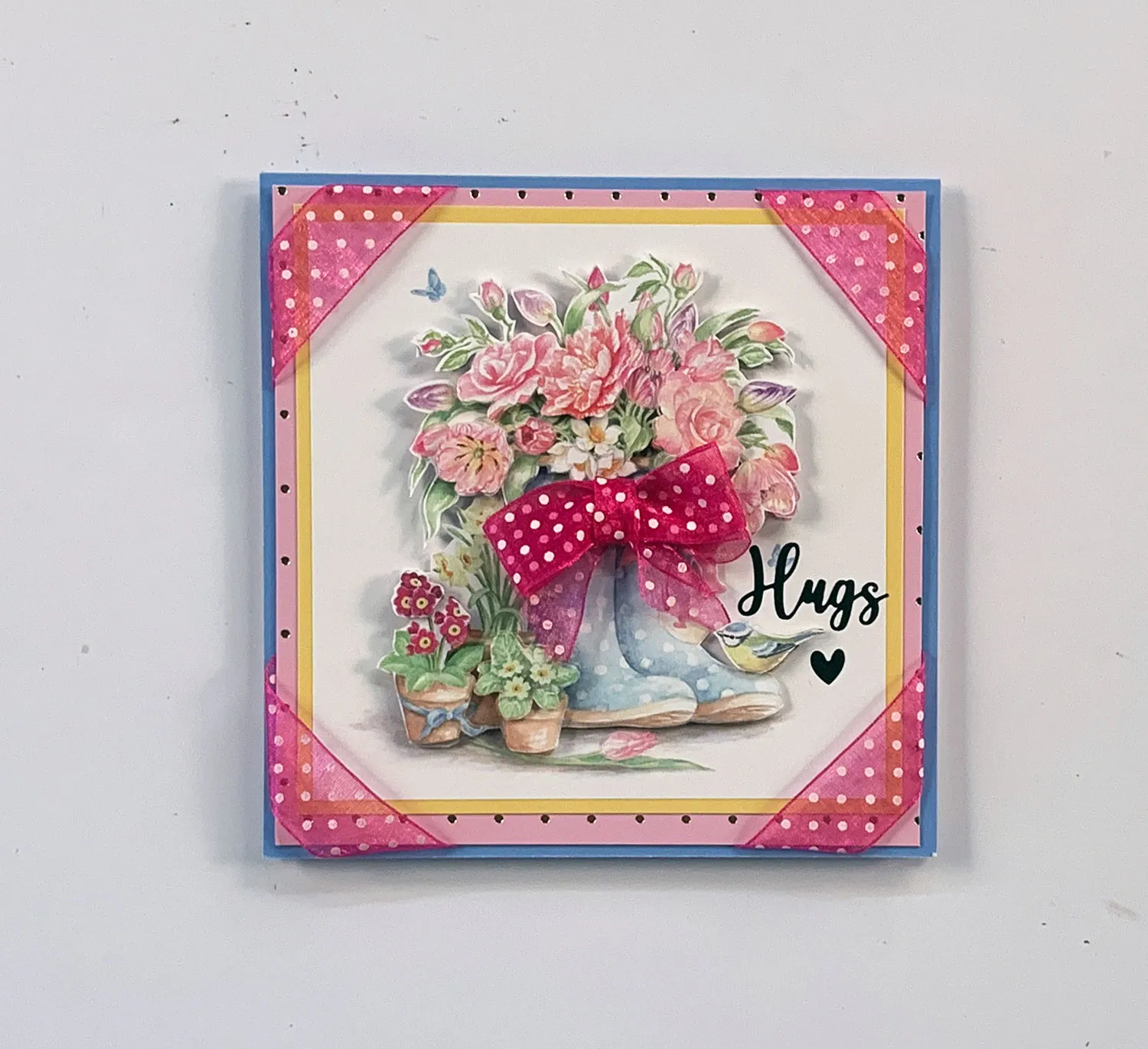 Cut 5 5/8”x11 ½” blue Adorable Scorable. Score and fold in half to make a 5 5/8” square card. Mat the rainboots sheet from the Little Book of Springtime Wishes on yellow Adorable Scorable with 1/8” borders. Mat again on pink dot foiled Adorable Scorable with 3/8” borders. Wrap magenta ribbon around the corners and glue the excess to the back. Glue to the card leaving a 1/8” blue border. Fussy cut the layers from identical pages and foam tape to the original image. Zot™ a magenta bow in center and select Dazzle ™ greeting.