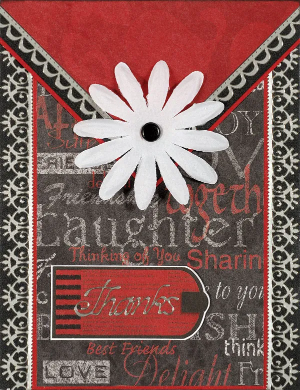 Add a black standard brad to the center of the white flower, then Zot™ it over the point of the triangle on the card front. Place the “Thanks” Dazzles™ centered on the red/black tag. Mat on white cardstock, then glue to the card front as shown.