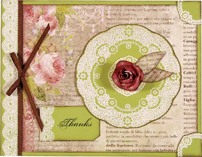 Inside the card: Ink the edges of a 4”x3 ¼” roses/dictionary paper rectangle with brown ink and glue centered to the inside. Write or computer print “For everything” on green cardstock, then trim to a 2 ¼”x2” rectangle, with the words ¼” from the top. Stamp and emboss the scalloped border image across the bottom of the rectangle. Ink the edges brown. Ink the edges of a ¼” wide strip cut from remaining roses paper, then glue across the rectangle just above the embossed border. Trim edges evenly. Glue centered to the roses paper rectangle. Zot™ a knotted ribbon as shown.
