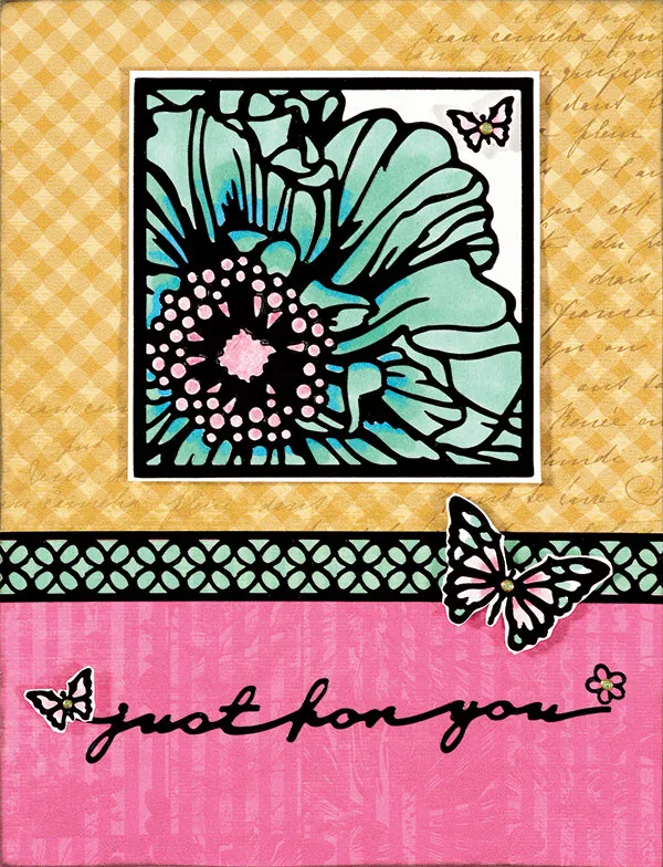 Card front: Place the card fold on the left and cover the bottom 2 ¼” with pink paper and the remaining card with gold gingham paper and ink card edges. Back the Botanical Dazzles™ border with green stripe paper and glue across the seam between papers and “just for you” Greetings Dazzles™ centered on the pink border at the card bottom. Mat the large square Botanical Dazzles™ flower with white cardstock, leaving 1/16” border around edges. Color the inner areas of the flower petals with BT5 dark turquoise Spectrum Noir pen and then color all of the petals with BT2 light turquoise and blend the darker turquoise with the lighter using the BT2 pen. Color the flower center with Pink Spectrum Noir PP3 pink. Glue the square flower Dazzles™ to the center of the gold gingham ½” from the card top.