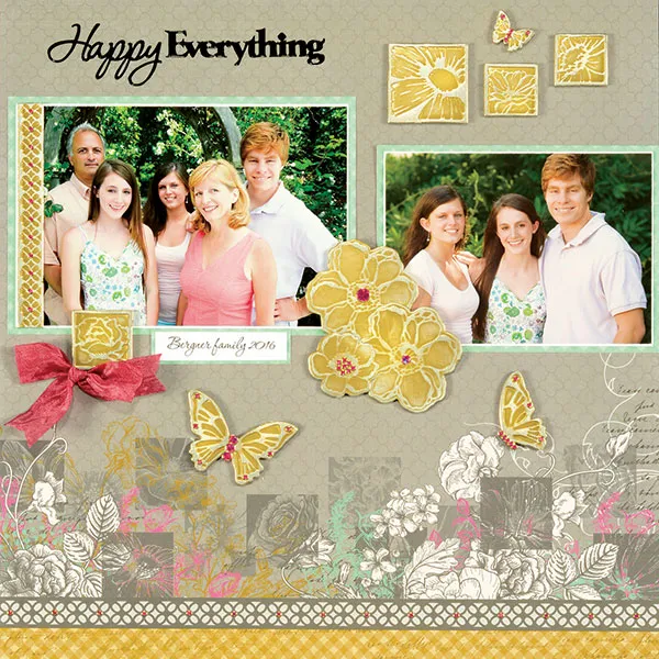 Both pages: Mat the photos on white cardstock with thin borders, then mat on Botanical Frames aqua gingham paper with 1/8” borders. Glue on the Botanical Frames gray floral border background paper as shown. Sand the embossed surface of the Botanical Frames Foiled Fancies you wish to use and wipe off any residue with the paper towel. Trim border pieces to fit and glue on the edges of the photos as shown. Foam tape remaining Foiled Fancies in place as shown.