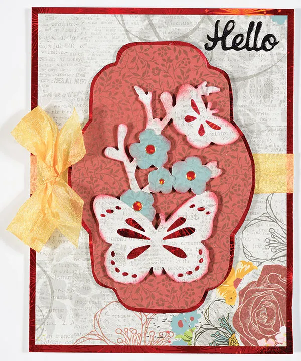 Use the largest cutting die with Sunday Musings script paper to cut a branch with flowers and butterflies. Ink the edges. Use the large and medium butterfly cutting dies to cut backgrounds from red fireworks holographic paper. Glue behind the butterflies. Use the large and small flower cutting dies to cut three large and one small flowers from Sunday Musings blue paper. Glue over the flowers on the branch. Place a Dazzles™ in the center of each. Foam tape to the label. Place the “Hello” Dazzles™ on the top right.
