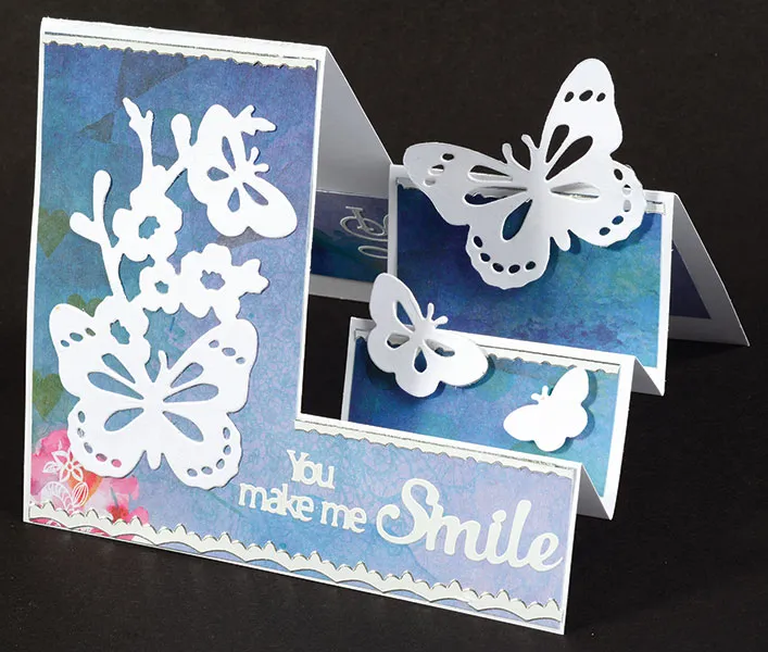 Use the largest cutting die with white cardstock to cut a branch with butterflies. Glue on the large side step. Use the large and medium base butterfly cutting dies with white cardstock to cut two die-cuts. Place the matching butterflies into the large cutting die. Tape lightly in place, and run through the machine to get the die-cut designs on each butterfly. Foam tape on the side steps as shown. Die-cut a small butterfly base, and foam tape on the second step. Place border Dazzles™ a shown.