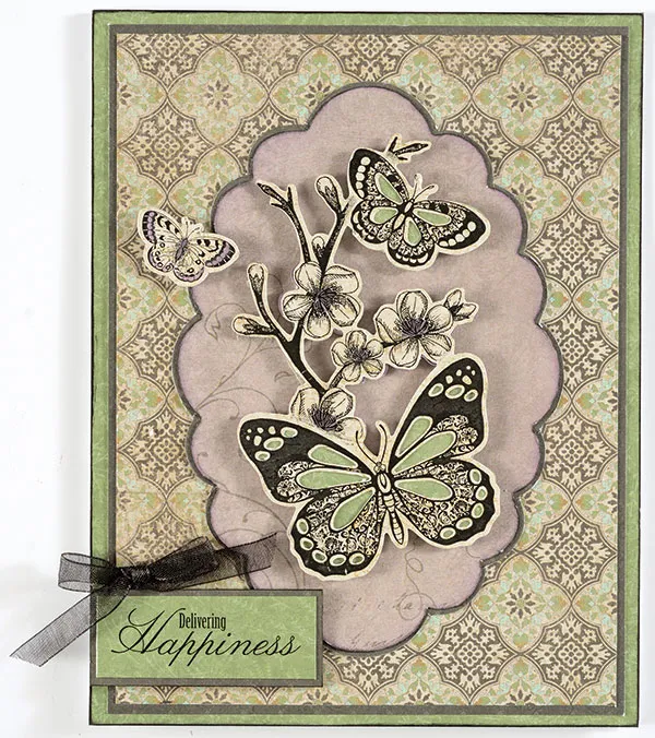 Stamp a small butterfly image on the small ivory butterfly die cut with black ink. Use the cotton swab to apply wisteria ink as an accent. Use the Design Tool scalloped oval to create a pale lavender oval and mat on dark gray paper. Glue centered on the paper-covered card front. Foam tape the butterflies/branch die cut centered on the oval. Add small butterfly and ribbon. Stamp the greeting on green paper, trim and mat as shown. Glue in place.