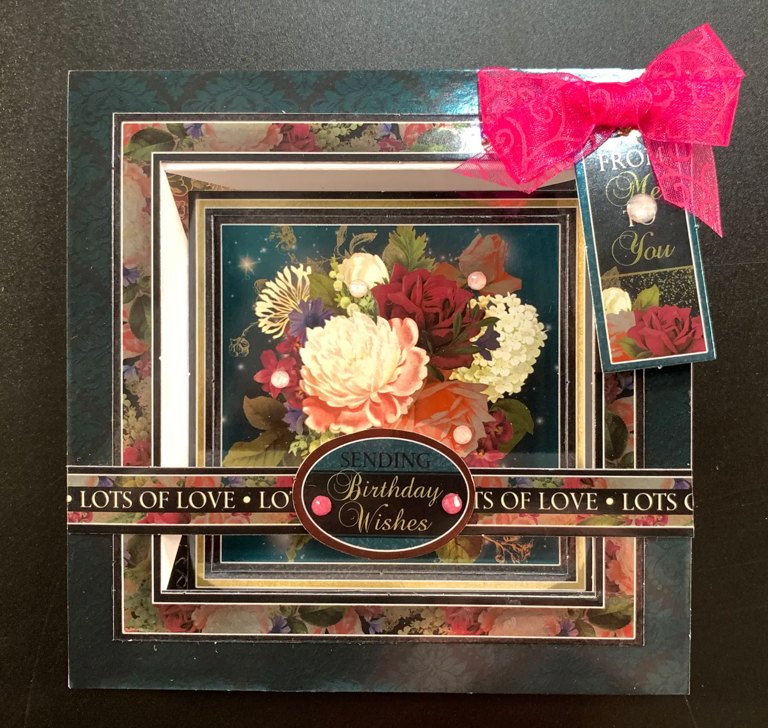 For inside left: Glue Adorable Scorable to remaining white square included with package. Cut acetate to 2 3/8” square, turn on point and glue to the center. Glue square topper sentiment to the center and add gemstones.