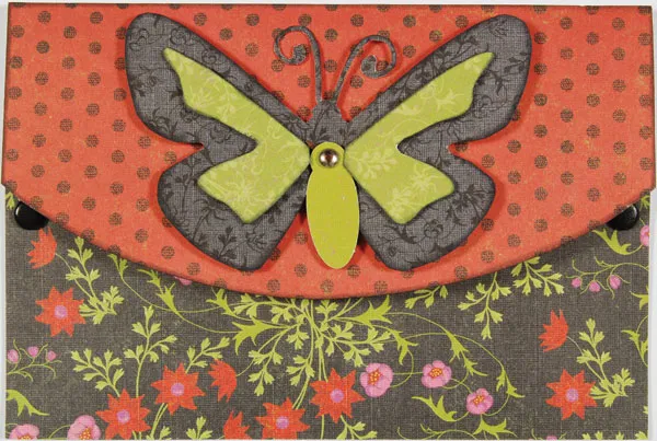 Cover bottom flap with black floral print paper. Apply glue stick to the back of the flap, along the right and left edges only, and adhere to the card inside. Secure in the top corners with black brads, creating a pocket.