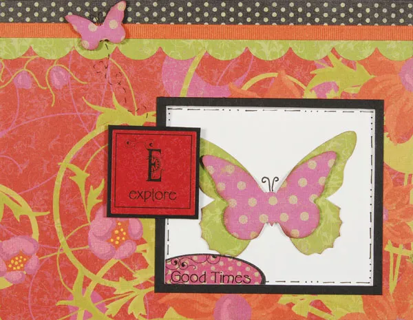 Glue a black dot border along the top edge of the card. Use the template’s scallop edge to make a ½” wide scallop border from green floral paper. Glue below the dot border and adhere a red sticker border over the paper seam. Foam tape a small pink dot butterfly to the left side of the border and use the pen to raw antenna and loopy trail.