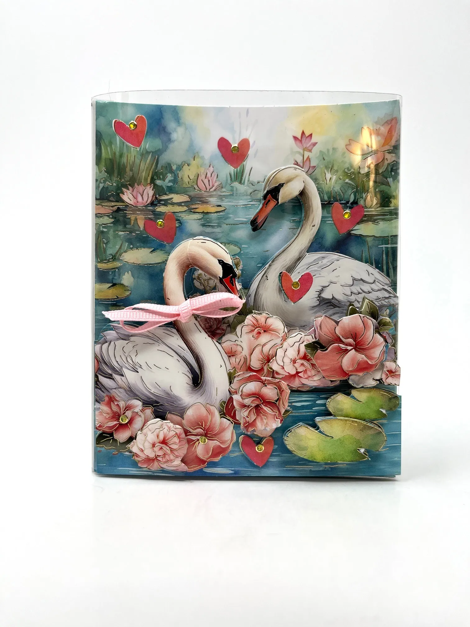 Cut off the bottom tab and the white tab from B. Foam tape swan layer onto the acetate. Foam tape other pieces over the matching art as shown. Place gold Jewel Dazzles™️ as shown. Make and Zot™️ a 2” wide pink bow from the 1/8” Ribbon Set onto the left swan’s neck.