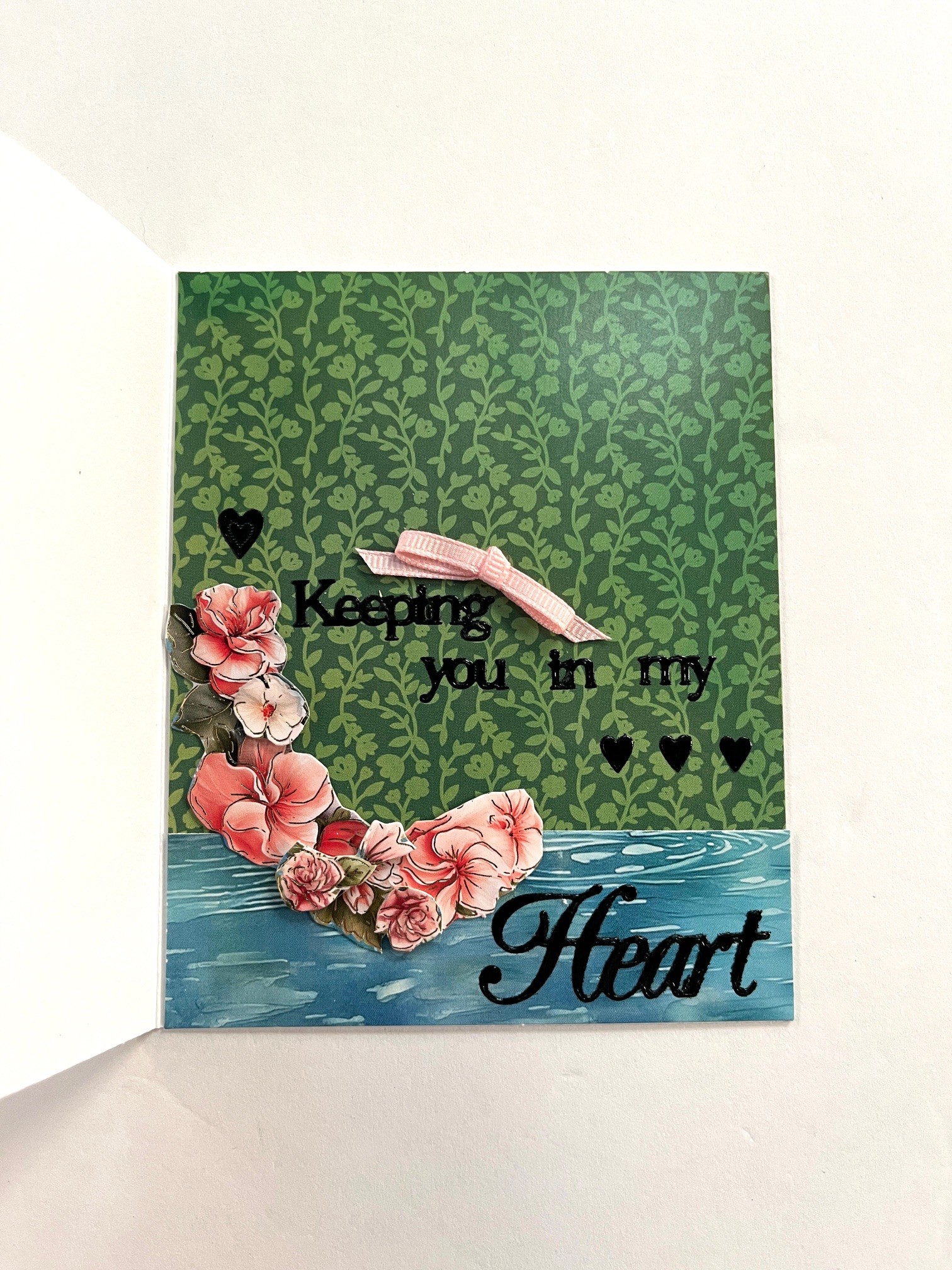 Card inside: Cut out and tape the green section to the card inside. Trim off the bottom area of the original base piece and tape to the bottom. Tape and foam tape the remaining flowers on the bottom left. Place “Keeping You in my Heart” Dazzles™️ in the bottom half of the card. Make and Zot™️ a 1” wide pink bow from the 1/8” Ribbon Set and place on top of the sentiment.