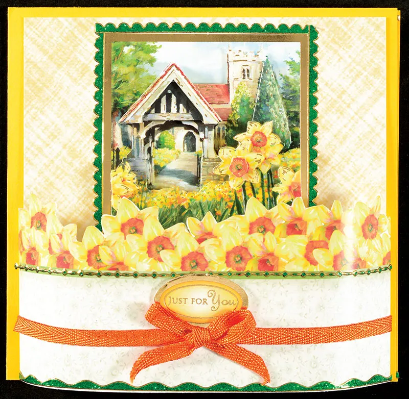 Use foam tape to assemble the Daffodil and Building Square from the Church Scene & Cottage Garden punch-out page. Set aside.