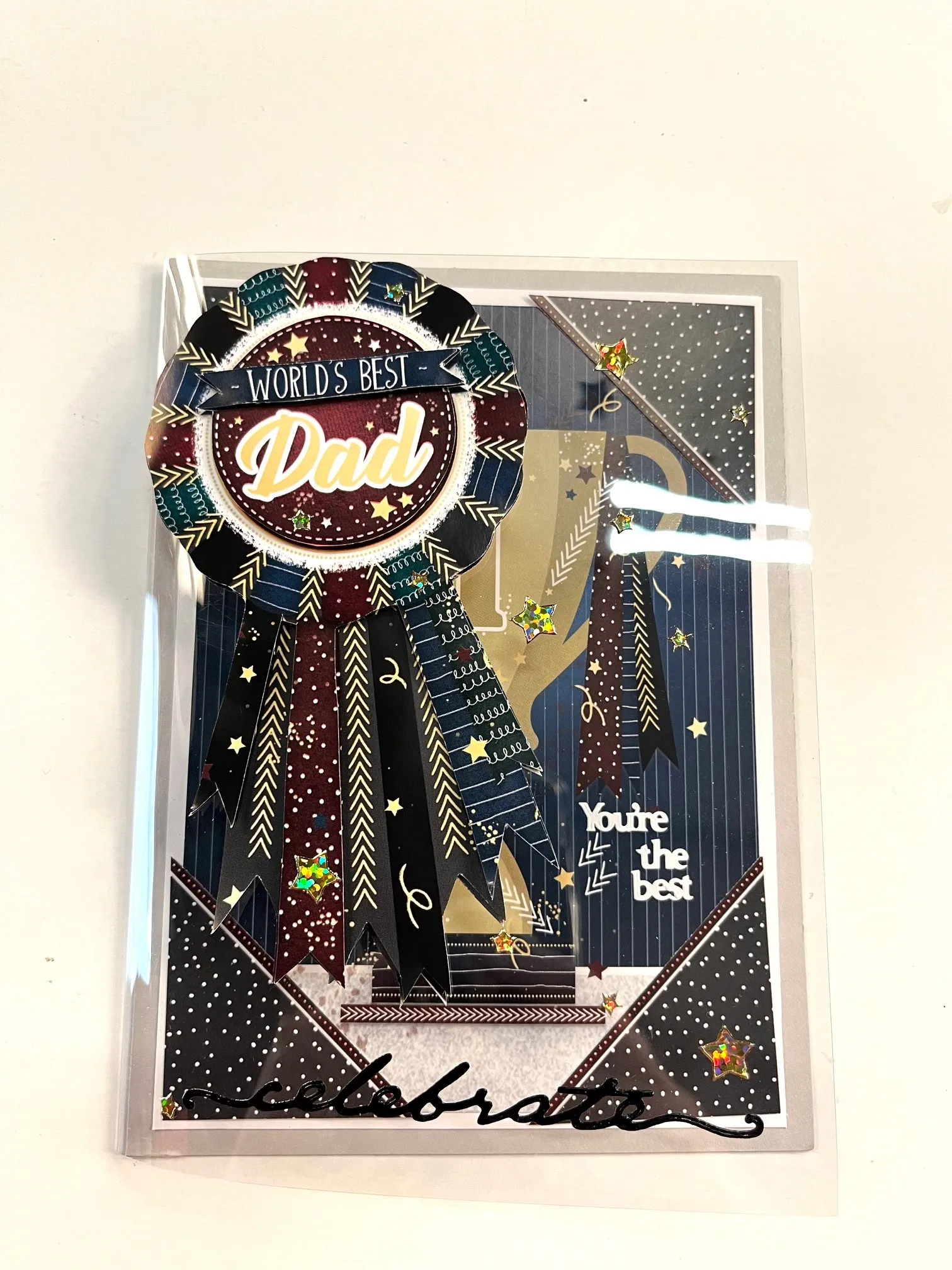 From the Little Book of Treasured Moments trim out the 5 pages into layers from the "World's Best Dad" ribbon trophy as shown, save four corners for inside. Use Extra Sticky Tape to attach the full ribbon trophy at an angle on the acetate. Foam tape another full layer over the first one. Foam tape the circle with three ribbons and foam tape the Dad circle with “World Best” as the final layer. Place "Celebrate" black script Dazzles™️ 1/2" from the bottom. Place gold stars Dazzles™ as shown.
