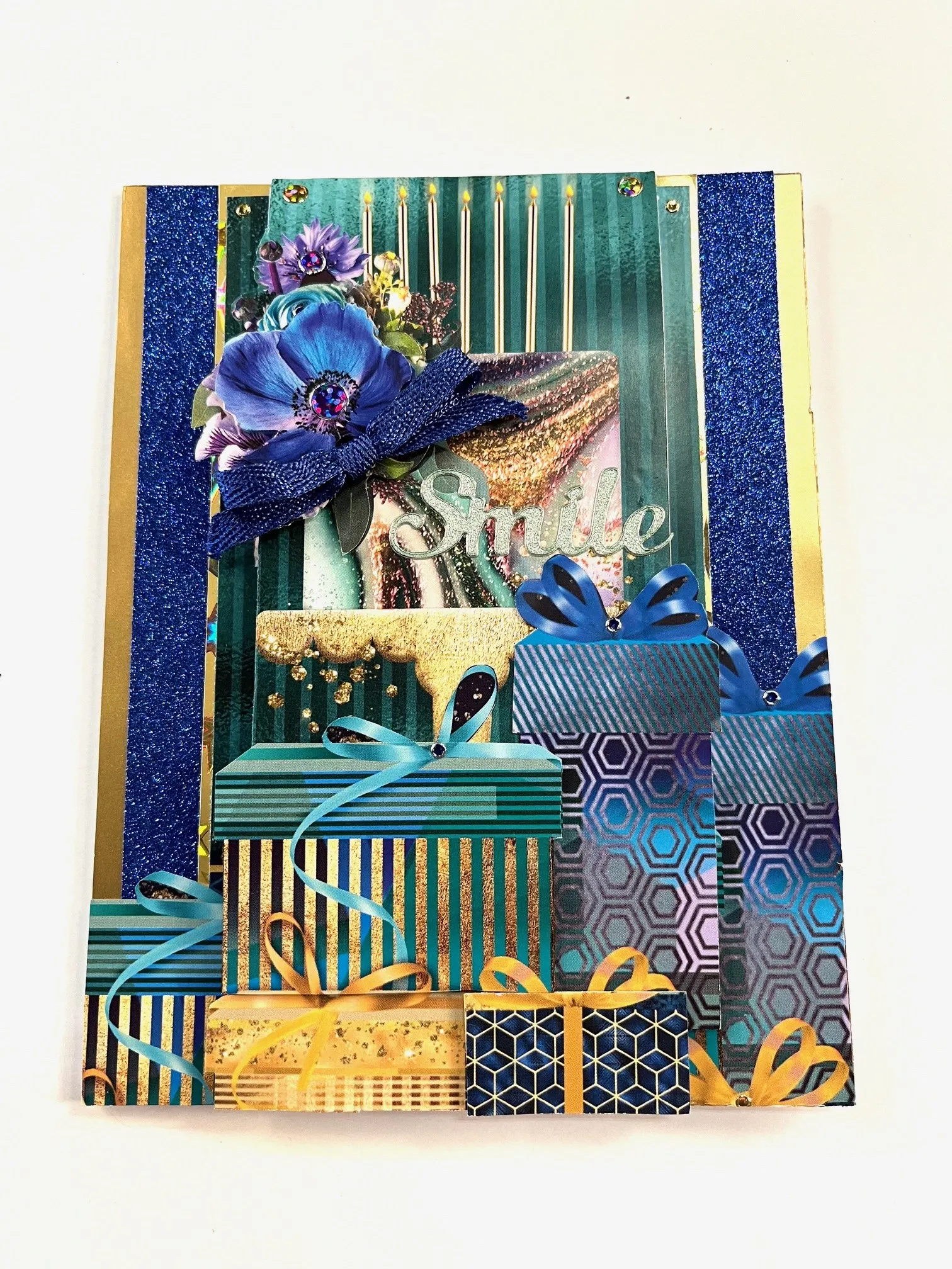 Tape 3 1/2"x6 1/2" gold stars holographic in the center leaving a 1/2" blue glitter border on either side. Trim down the jewel toned cake page from the Little Book of Treasured Moments to 3 3/8" wide and tape to the gold stars holographic leaving 1/8" gold stars holographic border on all sides but the bottom which will get covered. Cut and layer the accompanying gifts page across the bottom.