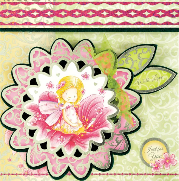 Glue the “Just for You” round label (from “Pretty in Pink” sheet) on the bottom right corner and glue two small flowers (from “Very Special Sweetheart” sheet) as shown. Foam tape a small heart (from “Fairy Kisses” sheet) on the center label.