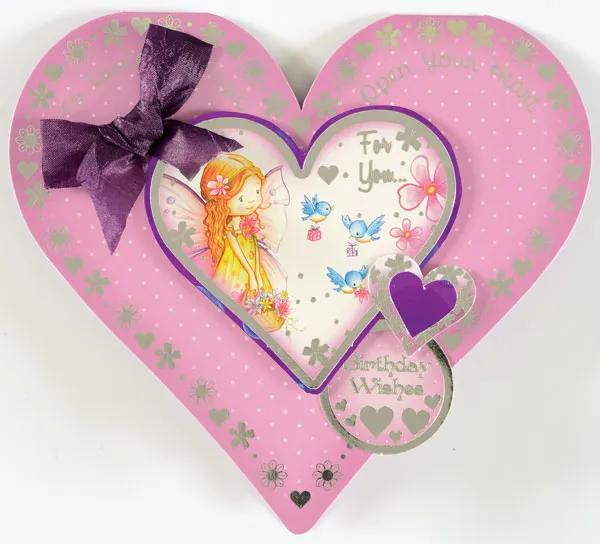 Punch out all of the pieces for Feathered Friends. Fold the lilac card in half with the fold at the top. Mat the small “For Your” heart on purple holographic paper leaving 1/8” borders. Glue to the center just below the words, matching the heart centers. Trace and cut the smallest heart on the purple holographic paper. Foam tape to the of a flower heart. Foam tape to the bottom right of the large heart. Glue “Birthday Wishes” circle just under the heart. Zots™ a purple crepe bow to the top left card front.