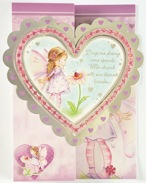 Glue the Polka Dot heart from Feathered Friends to the bottom right corner, and foam tape a small fairy from My Little Sweetheart on top. Add Pink Border Dazzles™ and small Pink Jewel Flower Dazzles™ as shown.