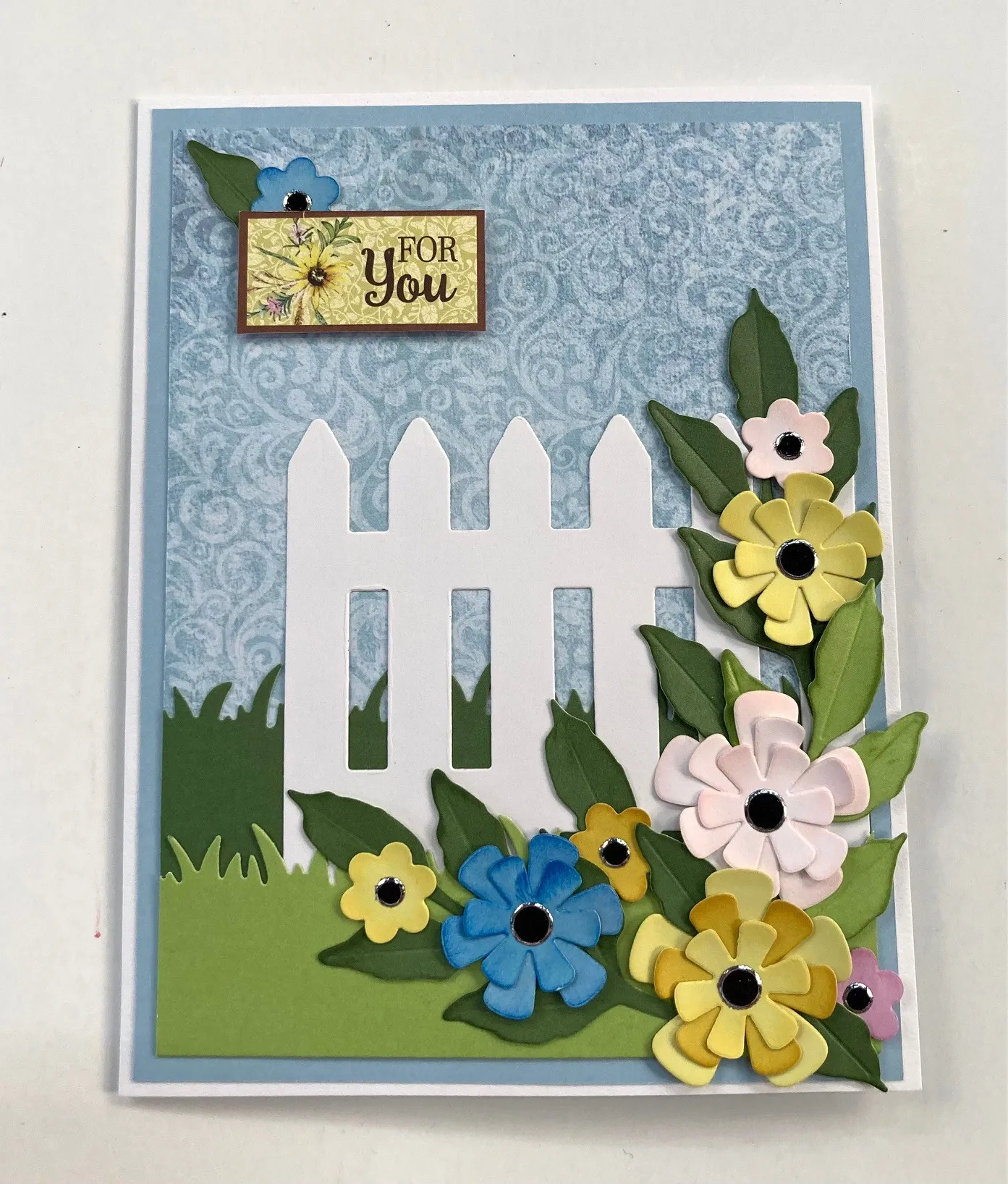 2. Die cut the picket fence from white cardstock and cut a section of six pickets off the left end. Glue them to the front, positioned ¾" above the bottom. Glue the medium green grass across the cardstock, aligning the bottom with the edge of the cardstock. Mat the cardstock on light blue solid cardstock with ⅛" borders. Glue it centered on the card front.