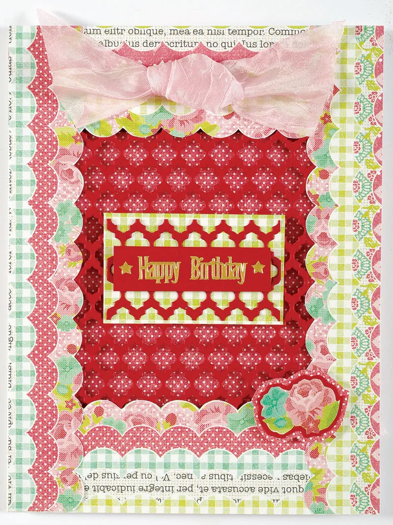 Cut a 2 1/4”x1 3/8” piece of the other lattice die-cut. Mat on Penelope green check with a 1/16” border and glue centered on the lattice window. Place a “Happy Birthday” and two star Dazzles™ on a 2 1/8”x1/2” red cardstock and foam tape as shown. Cut out a small flower from the Penelope pink floral paper, mat on red cardstock then on Penelope pink dotted with 1/16” borders and foam tape as shown. Knot a 6” length of Penelope pink crepe ribbon and Zot™ as shown, trimming ends.