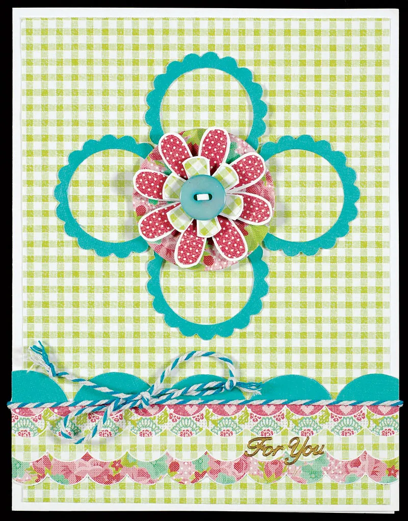 Die cut four 1 5/8” scallop circles and cut a 1 1/4” circle from the center of each. Place all 4 at the top of the card with edges touching, as shown. Foam tape a 1 7/8” circle from Penelope rose paper and foam tape over the center of the 4 touching circles. Trace a 2B flower onto Penelope pink dot paper and 4D flower onto Penelope lime gingham. Mat both with white cardstock, leaving 1/8” border. Layer with foam tape, then top with a blue button threaded with a thin strip of white paper.