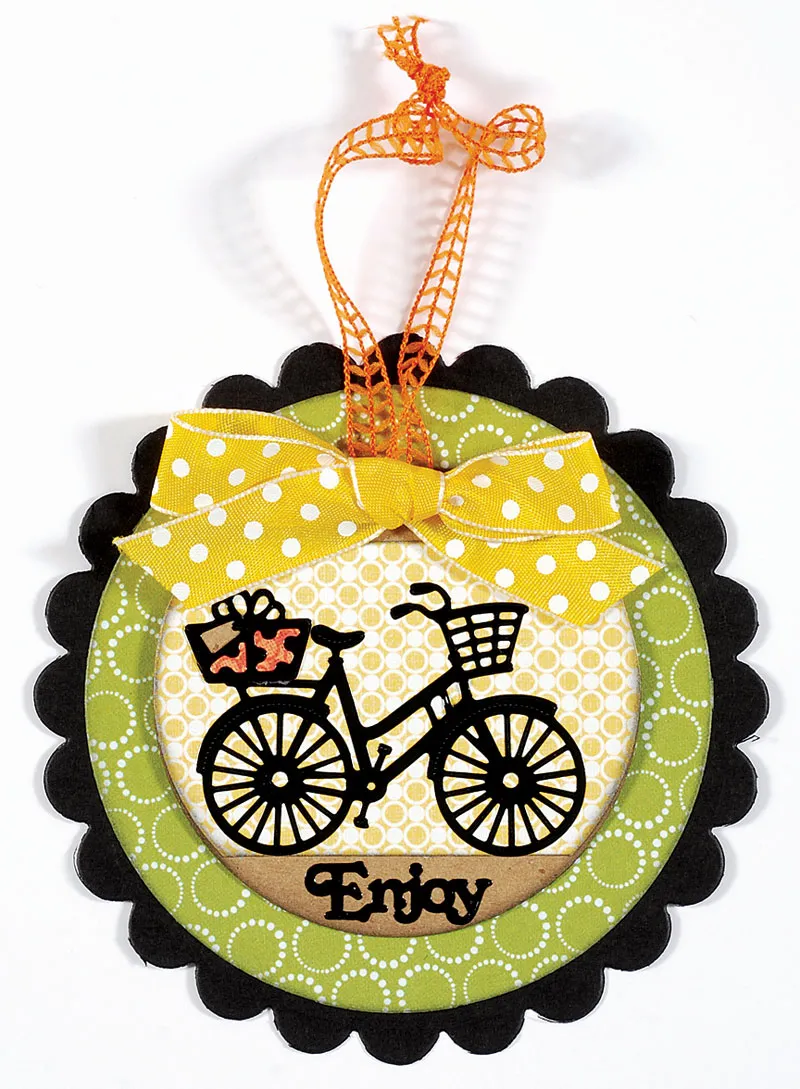 Place a small bike Dazzlesä on the yellow circle strip. Back a gift Dazzlesä with Happy Days orange dot paper and Kraft cardstock for the tag. Glue to the back of the bike. Place “Enjoy” Dazzlesä on bottom of circle card as shown. Tie the ends of 6” length of Happy Days orange grid ribbon and Zotä to the top of the circle card fold. Use a 9” length of 1/2” wide Happy Days yellow dot ribbon to make a bow and Zotä over the grid ribbon.
