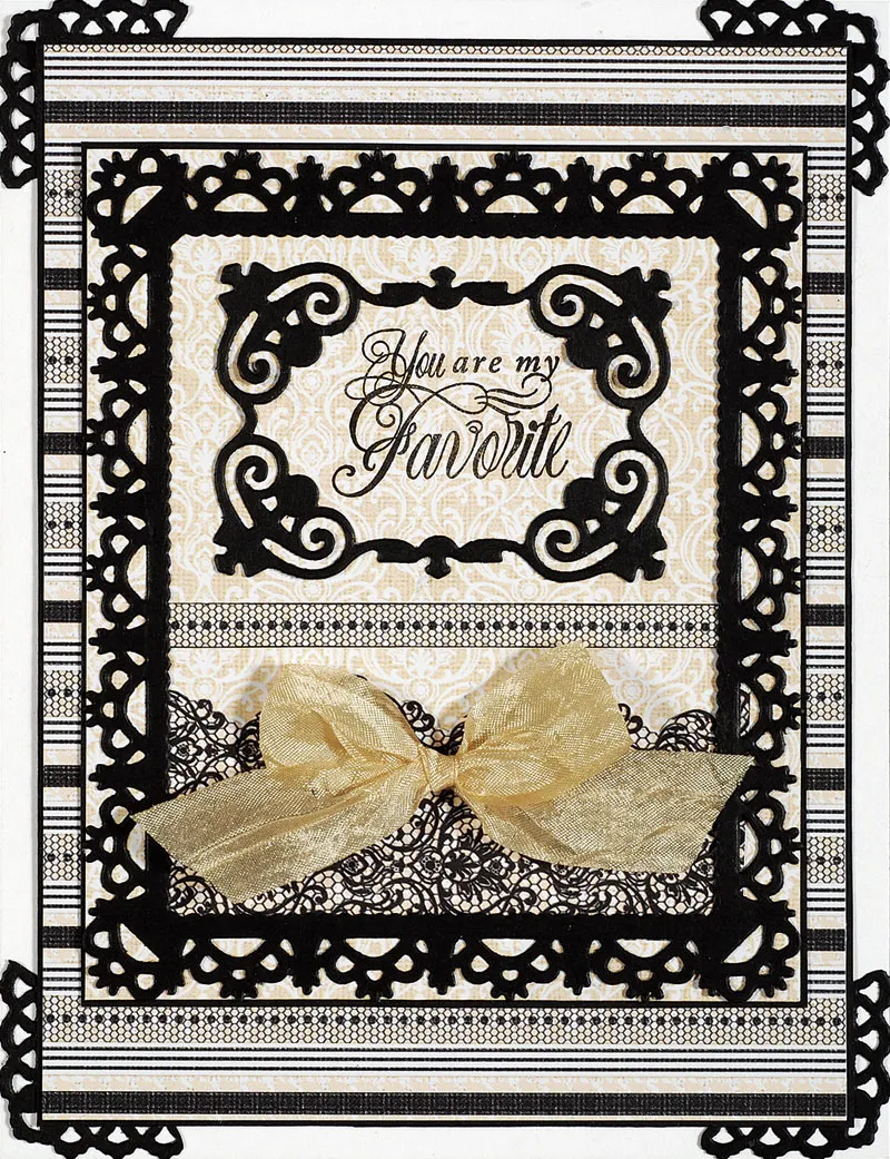 Place the frame on the tan flourishes paper with the black lace border at the bottom. Glue the bottom edge in place. Stamp “You are my Favorite” with Black ink, centered near the top of the tan flourishes paper inside the large frame, 1/2” from the inside top edge of the frame. Heat set the stamped image to dry it quickly. Glue a small die-cut frame so the words are centered inside. Cut a 3 1/4" long black lace strip from striped paper and ink the edges. Glue across the tan flourishes paper between the small die-cut frame and the lace border paper. Tie a bow from White Truffle 3/4" wide ivory crepe ribbon and Zot™ to the lace paper as shown.